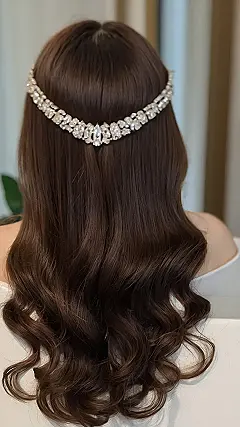 Hey there, future prom queens and stylish superstars! Check out this gorgeous hairstyle – long, luscious locks with a dazzling jeweled headband. It’s like something straight out of a fairytale, but way easier to achieve than taming a unicorn! Imagine yourself rocking this look at a special event – you’d totally steal the show. It’s elegant, it’s sophisticated, and it’s got enough sparkle to rival a disco ball. Seriously, who needs a tiara when you have *this*?