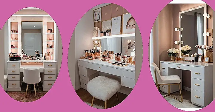 This isn’t just a regular spot to put on your face; it’s a full-blown glam operation center, looking like a secret lab where all the best beauty potions are brewed! With all that gorgeous gold and soft pink, it’s giving major “treat yourself” vibes. Look at how perfectly every single brush and palette is lined up – they’re practically standing at attention, ready for duty! You could probably do makeup for a whole movie cast with this collection, and the best part is everything has its own designated spot, meaning no more frantic digging through a messy bag to find that one elusive lip gloss. It’s a makeup artist’s dream setup, but way tidier than mine on a typical school morning.