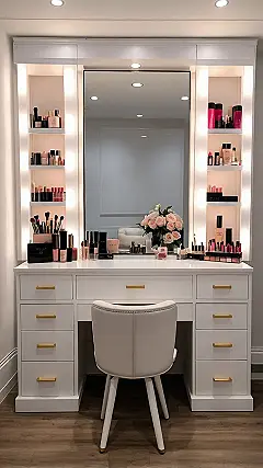 This isn’t just a makeup desk; it’s practically a beauty salon starring you! Look at that epic mirror with all the lights – it’s like having your own personal Hollywood spotlight, guaranteeing you’ll never accidentally leave the house with blush only on one cheek again (we’ve all been there, right?). The super fluffy chair just screams “sit here and feel fabulous” while you perfect your winged liner. Plus, those gorgeous flowers make the whole space feel so fresh, even if you’re just trying to figure out which lip gloss to wear. It’s the kind of makeup room design that makes getting ready feel less like a chore and more like a red carpet prep session.