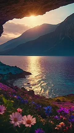 Imagine you’re a little flower, just chilling in a field. You’re soaking up the sun and enjoying the breeze, and then BAM! You look up and realize you’re actually hiding in a secret cave. Through the opening, you see a view that could make even the grumpiest troll smile – sparkling water, majestic mountains, and the sun setting in a fiery sky. It’s like a hidden treasure chest full of gorgeous scenery!