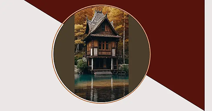 This wooden cabin looks like something straight out of a fairytale! It’s built from wood, of course, and even has a thatched roof, which means it’s covered in straw. This kind of roof is super old-school and reminds you of houses from long ago. The cabin is perched up on stilts like a giant wooden birdhouse, giving it an extra dose of charm.