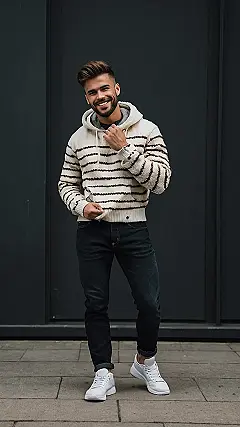 Hey there, fashion fans! Check out this dude rocking the ultimate “mens jeans outfit.” He’s totally nailed the casual-cool look with those dark jeans and a super comfy-looking striped hoodie. It’s like he raided his grandpa’s closet for the sweater (in a good way!), and then paired it with jeans that are begging to be worn on a weekend adventure. Notice the slightly cuffed jeans? That’s a subtle touch that adds a bit of personality. The whole outfit screams effortless style – something everyone should aim for, right? Bonus points for the clean white sneakers; they keep things fresh and prevent any style overload.