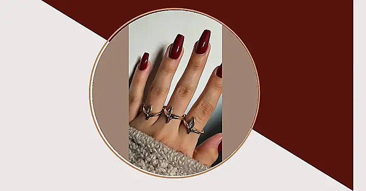These nails are giving us major fall vibes! That rich burgundy shade is like a cozy autumn evening, and those delicate leaf rings are the perfect touch of nature. It’s like someone took a walk in the woods and brought back a little bit of magic to their fingertips.