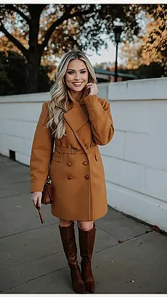 This outfit is giving us major fall vibes, and not just because the leaves are turning! This midsize gal is rocking a stylish, tan coat that’s totally on-trend. It’s got that classic double-breasted look, and those big buttons are just begging to be fastened. And let’s not forget about the killer knee-high boots! They’re the perfect touch of edgy and elegant that every outfit needs.