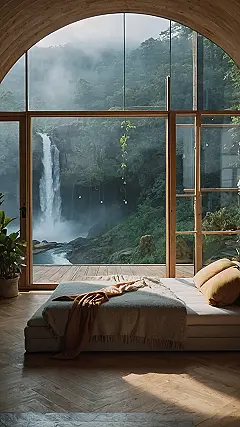 Imagine waking up to a stunning view of a waterfall cascading down a lush green mountainside. No need to even leave your bed! That’s the kind of “Nature Living Spaces” dream this photo is showing us. It’s like having your own personal window to nature’s masterpiece. You could spend your days reading a book, sipping coffee, and enjoying the peace and quiet, knowing you’re surrounded by nature’s beauty. And hey, if you get bored of reading, you can always just stare at the water and pretend you’re a brave little fish swimming upstream!