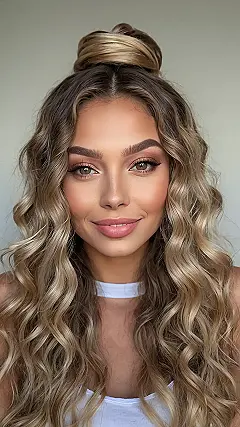 This girl’s got the curls to make any mermaid jealous! Just look at those gorgeous waves flowing down her back – it’s like she’s got a whole ocean of hair going on. She’s rocking a cute little bun on top, like she’s saying “I’m stylish, but I’m also ready for anything!” It’s the perfect way to get those pesky curls out of your face while still looking super chic, especially if you’re rocking a little summer dress or a cute crop top.