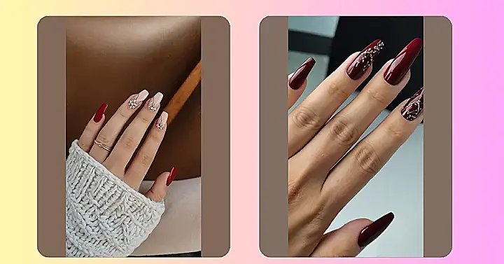 These gel nails are absolutely stunning! That deep red color is so elegant and sophisticated, and the sparkly accent nail adds a touch of fun and personality. It looks like these nails are ready to take on anything, from a fancy dinner to a night out with friends.
