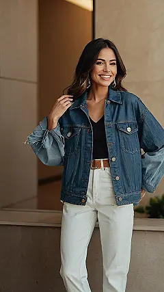 This cool chick is rocking a denim jacket that’s totally giving us major fashion envy! It’s like a classic denim jacket, but with a twist – those sleeves are looking super comfy and stylish at the same time. She’s paired it with some crisp white pants, and it’s a look that’s both casual and put-together, perfect for hanging out with friends or grabbing lunch with your bestie. Denim is always a good idea, and this outfit is proof that you can totally make it your own, no matter what your style is!