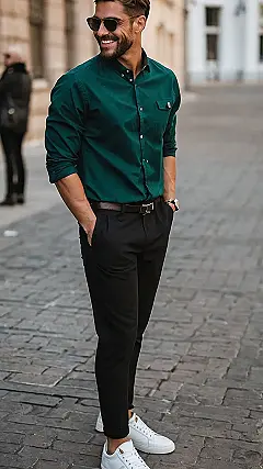 This guy is rocking the “effortlessly cool” look! Just look at him, strutting down the street in a stylish emerald green shirt. It’s like he’s saying, “Hey, I’m cool, I’m confident, and I know how to put together a killer outfit!” The black pants and white sneakers are classic choices that go with anything, but that green shirt really makes him stand out.