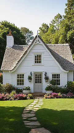 Walking up to this little white cottage exterior is basically like stepping into a fairy tale, except maybe one where the main character trips on the cute stepping stones because they’re too busy staring. Seriously, the white siding is so crisp it probably glows, and those black-framed windows and door look like they came straight out of a magazine. You can almost hear the birds singing happy tunes and smell fresh cookies baking inside, or maybe that’s just my hungry imagination working overtime because looking at something this perfect makes you crave snacks.