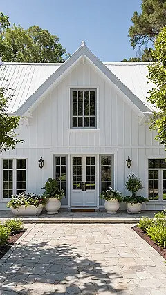 Walking up that neat stone pathway feels like approaching a really welcoming place. The big double doors look like they’re ready to swing open for a grand entrance, and the potted plants flanking them seem super happy and well-cared for. You can totally imagine hanging out on that stoop, maybe sipping something cold and watching the world go by, or at least watching squirrels try to figure out if the plants are edible. This white cottage isn’t just a building; it’s practically an invitation to relax and maybe take a really good selfie in front of that blindingly white backdrop.