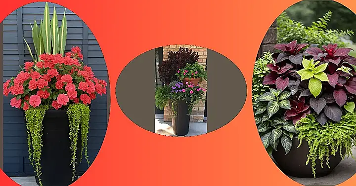 Just peek inside those pots in the image – it’s like a whole tiny ecosystem thriving together. You’ve got the tall, dark, and mysterious plants adding some drama, fluffy ferns doing their best leafy dance moves, and then bam! Bright pink and purple flowers showing off like floral superstars. Plus, those little vines tumbling over the side? They’re basically saying, “Hey, follow us inside!” It’s a perfect mix that proves front porch planters aren’t just containers, they’re tiny worlds of awesome waiting to greet you.