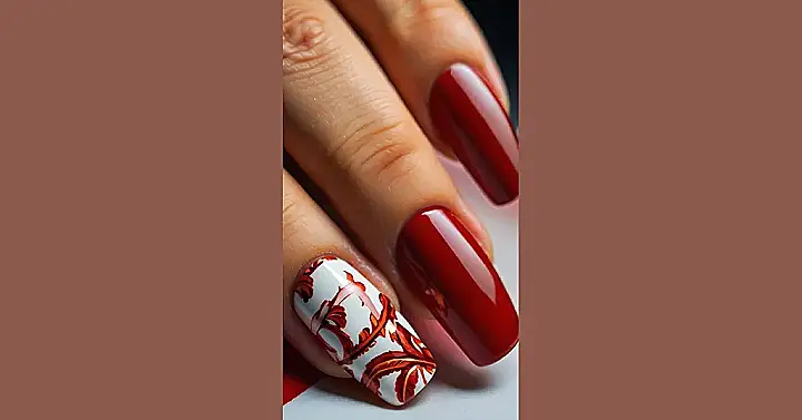 Those red nails are seriously giving off main character energy! They’re so glossy and shiny, you could practically use them as mirrors to check your hair between classes. Just try not to poke yourself in the eye, okay? And that one nail with the fancy leaf design? It’s like, “I’m red, but also, I’m cultured.”