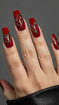 Check out the detail on those nails! It’s not just red; it’s a whole art project happening right at your fingertips. They’re almost too pretty to chew on… almost. Just try not to get caught doodling on your desk with them; your teacher might not appreciate your newfound artistic expression as much as your friends will.