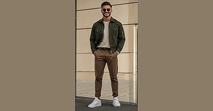 Want to look effortlessly cool like you just stepped out of a magazine? Check out this dude’s outfit! He’s rocking the ‘gents casual’ look with an olive green sweater and khaki pants – it’s like a sophisticated version of your comfy weekend clothes. Plus, those white sneakers are clean and simple, which means you can probably get away with wearing them even if you accidentally stepped in something gross on the way to school.