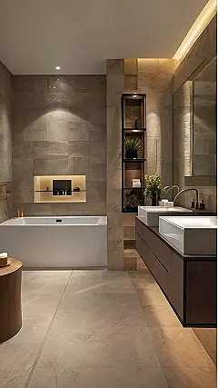 Check out those snazzy shelves! They’re not just for holding shampoo; they’re like little art galleries for your stuff. Imagine having a tiny plant display and a zen sculpture right next to your toothbrush. It’s the kind of bathroom that makes you want to sing in the shower, and not just because the acoustics are good. It’s a place where even doing chores like cleaning feel a little bit fancy.