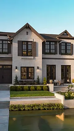 This house is not just a dream; it’s a winter dream come true! The dark roof contrasts beautifully with the pristine white walls, almost like a gingerbread house made of marble. The elegant design and beautifully landscaped grounds would even make Jack Frost jealous. It’s the kind of place where you’d feel like royalty – or at least, a very well-off snow queen or king!