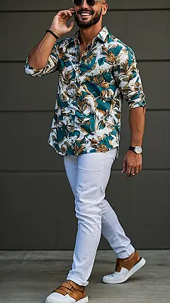This guy’s outfit is seriously blossoming! Check out that amazing shirt – it’s like a tropical jungle exploded onto fabric. It’s totally bold, totally print-astic, and definitely makes a statement. Pair it with some crisp white pants and you’ve got a look that’s both super stylish and effortlessly cool. He’s rocking the “mens Bold Print Shirt outfit” like a pro, proving that sometimes, the best way to stand out is to embrace the crazy beautiful.