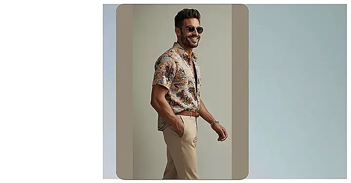 This guy’s got it going on! Check out that bold print shirt – it’s like a tropical vacation exploded onto fabric. It’s totally eye-catching, and paired with those effortlessly cool beige pants, he’s ready for anything from a beach bonfire to a backyard barbeque. Plus, those sunglasses? They’re the perfect finishing touch— like he’s straight out of a movie scene. He’s giving off serious “cool uncle” vibes, and it’s making everyone jealous of his awesome summer style.