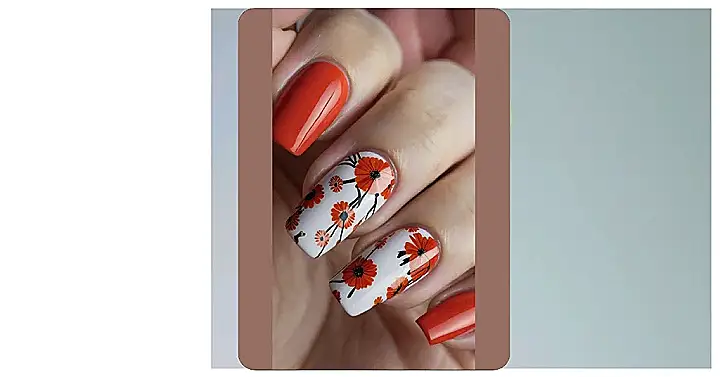 Think of these flower nails as your own personal tiny gardens. The bright orange pops against the clean white, making your hands look like they’re ready for a spring picnic, even if you’re just stuck in math class. Plus, that single solid orange nail adds a cool, modern twist. Get ready to bloom, babe!