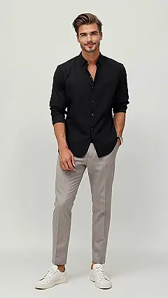 Want to look effortlessly cool without looking like you tried too hard? Check out this outfit! It’s like the uniform for a guy who’s about to casually save the world. A dark button-down shirt paired with khakis is a timeless combo, kind of like peanut butter and jelly, but for your clothes.
