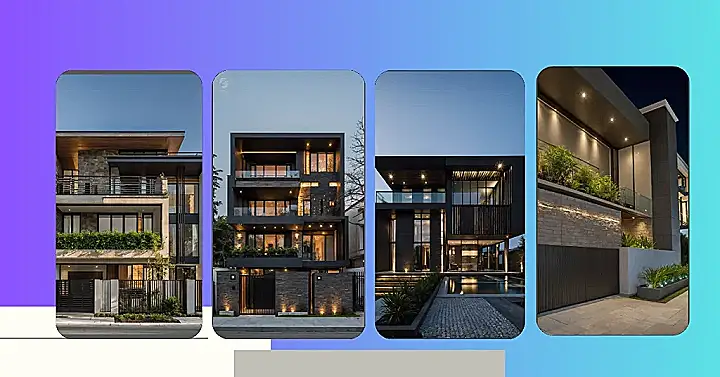 Check out how this place uses stone, dark panels, and even wood accents – it’s like a fashion show but made of building materials! And those huge windows and lit-up balconies? They’re basically saying, “Hey world, look how awesome I am, even at night!” Getting the front elevation design just right is super important because nobody wants their house to look like it rolled out of bed without brushing its teeth. It’s all about making a great first impression, architectural style!