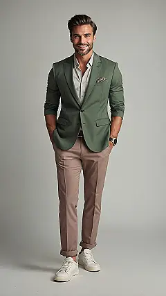 This dude in the picture is showing us how it’s done when it comes to looking sharp without needing a superhero costume. That green blazer is pretty epic, like he’s ready to charm his way into anywhere cool. Pairing it with those lighter pants and a casual shirt keeps it from feeling too formal, making it the perfect ‘well dressed men outfit’ that says “Yeah, I look good, but I’m also ready to ditch the tie and grab some burgers.”