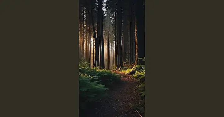 This picture is like a secret world hidden in the middle of the woods. Imagine a forest where the trees are so tall, they block out almost all of the sunlight. But, just when you think it’s getting gloomy, a magical ray of sunshine shines through the branches, like a spotlight in a theater. The light is so bright, it makes the leaves sparkle and dance, and the air feels warm and cozy. It’s like a little reminder that even in the darkest of places, there’s always something beautiful to be found.