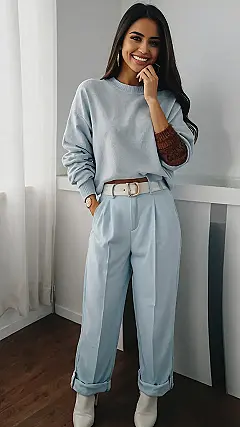 This outfit is so cute, it makes you want to pack your bags and head to Paris! The soft blue sweater and matching pants are perfect for a day of sightseeing, and the white boots add a touch of elegance. And let’s not forget the brown sweater sleeve detail – it’s a fun pop of color that says, “I know how to put together a great outfit!”