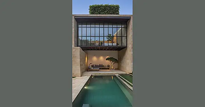 Check out this pad! It’s got all the fancy vibes – cool lighting, sleek furniture, giant windows upstairs probably showing off a massive bedroom. You look at the whole picture and think, “Wow, living the dream!” And then you spot the tiny pool. It’s less “dive in and do laps” and more “carefully step in and don’t splash too hard or you’ll empty it.” Honestly, trying to do a freestyle stroke in that might just result in hitting the wall and looking less like a swimmer and more like a confused otter.