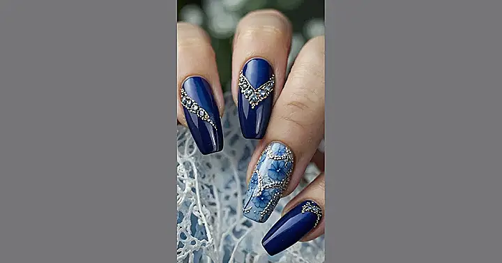 These blue nails are so brilliant they practically glow! Seriously, they look like someone captured a piece of the deep blue ocean and put it right on your fingertips. And those fancy designs with the little shiny bits? They’re like tiny masterpieces, making you feel instantly ready to attend a fancy party or just dramatically hold your hand up to the light and admire the sparkle. It’s like wearing tiny, super-cool suits on your nails.