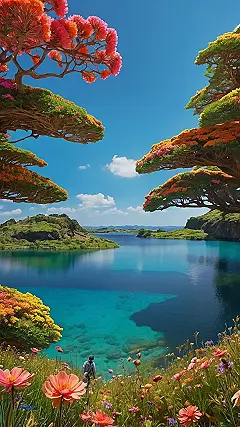 Imagine needing a break from all those tough math problems? Just slap this wallpaper on your screen, and suddenly you’re chilling in a flower-powered paradise! Seriously, who needs a vacation when you’ve got a vibrant flower landscape like this to whisk you away to a land where the water’s always turquoise and the trees are bursting with more color than a box of Skittles?