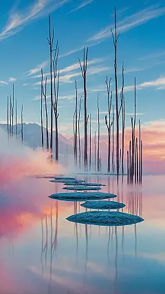 Feeling overwhelmed by homework and the general chaos of life? Just one look at this wallpaper is like hitting the ‘pause’ button on the universe. It’s got those cool, spooky-looking bare trees standing tall in the mist, like silent guardians of chill vibes. The water is so still it perfectly mirrors the dreamy pink and blue sky – honestly, it looks like a portal to a parallel dimension where stress doesn’t exist and your biggest problem is deciding which floaty rock island to step on next. It’s the ultimate visual chill pill.