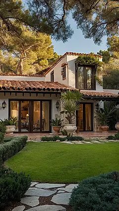 Picture this: you’re strolling along a sun-drenched path, the scent of warm earth and blooming plants filling your nose. Ahead, a stunning white house basks in the golden sunlight, its terracotta roof like a giant, sun-baked cookie. This isn’t just any house; it’s a Spanish Mediterranean dream home, straight out of a postcard! With its arched windows, charming stonework, and lush greenery, it’s like stepping into a storybook. Imagine yourself sipping lemonade on that patio, feeling the gentle breeze and the warmth of the sun on your skin—total relaxation!