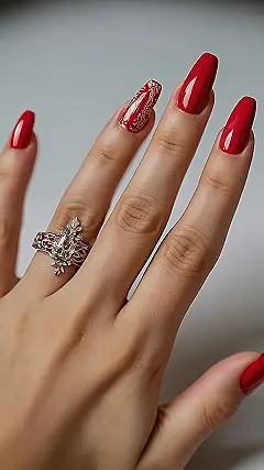 See that one nail with the fancy white pattern? It’s like the superstar of the group, showing off its cool design right next to that gorgeous ring. It adds a little ‘oomph’ to the classic red, making the whole hand look extra special. These red spring nails are basically proof that your hands are ready to steal the show, whether you’re holding a book, a smoothie, or just waving hello!