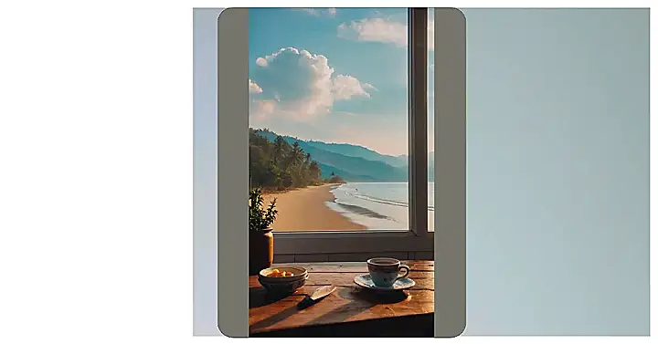 Imagine waking up to this view! A steaming cup of coffee, a table with a little snack, and a window view that looks like it’s straight out of a dream. It’s like the sun is saying “good morning!” to the beach, and the palm trees are waving back. This picture makes me want to grab a comfy chair, put on my favorite music, and relax for the whole day.