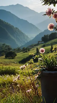 This picture is like a scene straight out of a fairytale. It’s a beautiful morning, and the sun is just starting to peek over these big, dreamy mountains. It’s so peaceful and quiet, you can almost hear the birds singing and the wind whispering through the grass. It looks like the kind of place where you could just sit and relax all day long, surrounded by the beauty of nature.