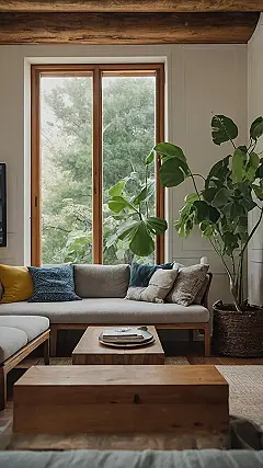 This living room looks like it’s straight out of a nature magazine! The big windows let in tons of sunshine, and the huge plant makes you feel like you’re chilling in a jungle. The couch is super comfy, perfect for relaxing and reading a book. Imagine curling up with a good story and watching the leaves sway in the breeze.