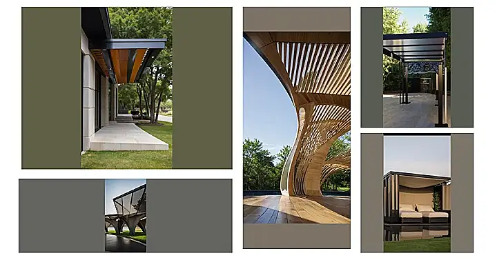 Imagine chilling on that couch under the wooden canopy. It’s like being under a giant, super-stylish comb! The canopy design uses lots of wooden slats to block some sun. That design is great because you can still see the sky, but you won’t get totally fried by the sun. It’s the perfect spot for relaxing and chatting with friends, maybe while enjoying some iced tea and debating the latest TikTok trends.