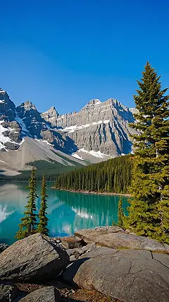 This picture is like a postcard from a dream! It shows a stunning lake in Canada, so clear you can almost see the fish swimming around. The water is an incredible shade of blue, like a giant swimming pool that nature built. And just look at those mountains! They’re huge and majestic, standing tall and proud, guarding the lake like giants.