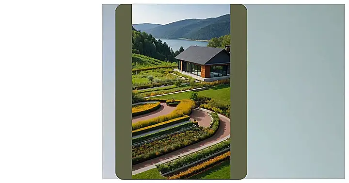 This picture isn’t just showing off a house – it’s showing off a house that’s got more personality than your average, run-of-the-mill home! It’s like the house is saying, “Hey, look at me! I’m surrounded by mountains, a lake, and a garden that’s more interesting than a science fair project.” The landscaping is super fancy with all these paths and different kinds of plants that look like they were hand-picked by a gardening expert. It makes you want to get lost in the gardens and explore every nook and cranny.