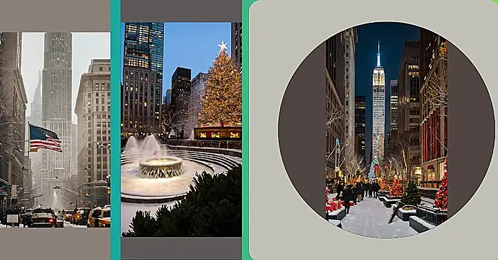 This picture is like a scene straight out of a holiday movie! Imagine walking through a snowy New York City park, with towering buildings around you. You hear the gentle sound of water splashing in a fountain, and you see the sparkling lights of a giant Christmas tree in the distance. It’s the perfect picture of winter wonderland in the Big Apple!
