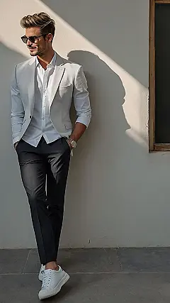 This guy looks like he’s about to star in his own movie, or at least order a really fancy coffee. Mixing dressy with casual, like the blazer and dress pants with sneakers, is totally in right now. It’s like telling the world, “Yeah, I can handle business, but I can also chase after the ice cream truck.”