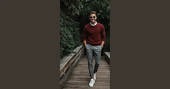 This guy’s got the classic men’s clothing style down pat! He’s rocking a maroon sweater, grey pants, and crisp white sneakers. It’s a look that’s been around for ages, but it still looks fresh and stylish. He’s like a walking example of how you can wear classic pieces and still look totally cool. Even with those trendy sunglasses, he still looks put together and confident – like he’s totally got this whole “adulting” thing figured out.