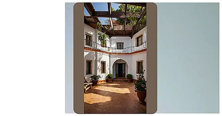 Imagine chilling here after learning all about Spanish verbs – way better than homework, right? This place is total Spanish style goals with its cool courtyard, terracotta tiles underfoot, and that awesome wooden pergola casting shade like a pro. You could totally picture someone strumming a guitar here while enjoying some tapas, or maybe just catching some sun while you video call your friends to show off your amazing Spanish vacation spot.