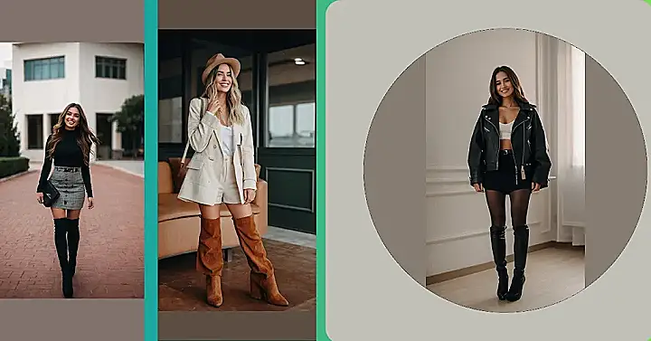 This outfit screams “fall” with its cool, edgy vibe. You’ve got the classic leather jacket, which is like the superhero cape of fall fashion – it protects you from the wind and looks totally awesome. The mini skirt adds a touch of playfulness and the thigh-high boots are just begging to stomp through some fallen leaves. This outfit is like a pumpkin spice latte – it’s warm, comforting, and definitely a fall must-have!
