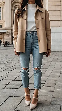 This outfit is a classic fall look, perfect for strolling through the crisp air and enjoying the changing colors of the leaves. The light brown jacket gives you that extra warmth without feeling too bulky, while the ripped jeans are super trendy and add a little bit of edge to your look. And those heels? They’re just the right amount of dressy to elevate your outfit from casual to chic. Just be careful not to trip on those ripped knees!