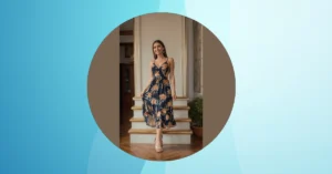 Looking at this floaty dress with all those pretty blue flowers, you can totally picture a mom wearing it and looking effortlessly elegant while also somehow managing to carry everyone’s stuff. It’s got that “ready for anything but make it fancy” vibe. You can almost hear it whispering secrets like “yes, there’s a tissue in my pocket” or “don’t worry, I packed an extra juice box.” It’s the kind of dress that just feels like it belongs in a sunshine-filled backyard or maybe at a slightly awkward family gathering where you need something distracting to look at.