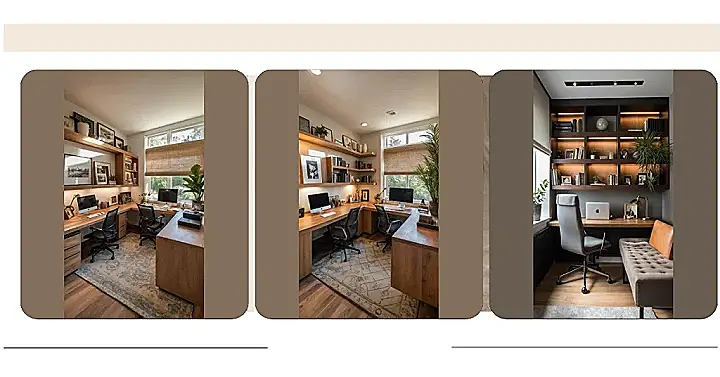 Having a home office setup like this would almost make doing homework… dare I say… bearable? With shelves for books (or maybe just cool stuff you want to display) and comfy chairs, you could technically stay in here for hours. Just picture it: zero distractions, pure focus, maybe even a strategically placed plant judging your work ethic. It’s like your own personal command center, except instead of launching rockets, you’re launching a campaign to get your essay done before the deadline. A totally chill and not at all stressful mission, right?