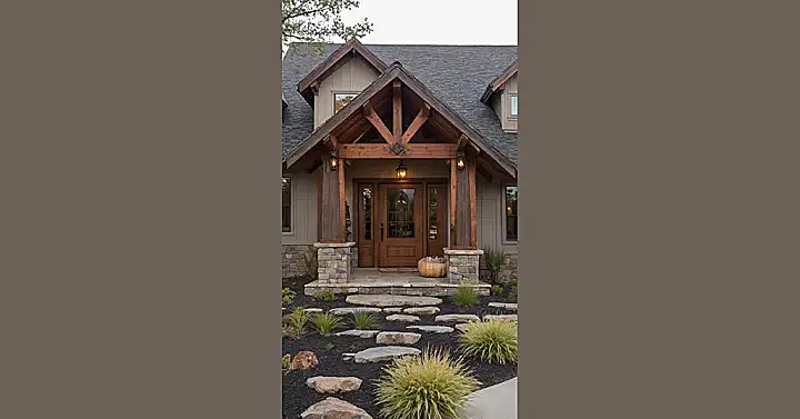 Stepping up to this cool ranch house feels like an adventure, thanks to those fun stepping stones sprinkled across the yard. They’re perfectly spaced for practicing your best rock-hopping moves or maybe just pretending the dark mulch is a river of chocolate. The way the wood and stone come together makes the whole place feel super grounded and natural, even if the only animals you see are squirrels plotting to steal that pumpkin. It’s definitely the kind of spot that screams “kick back, relax, and enjoy the view!”